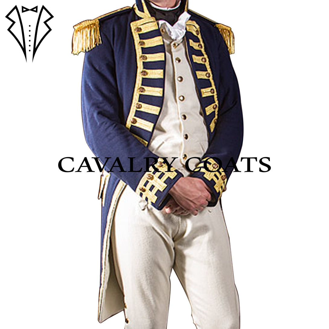 The Men's British Royal Navy Vice-Admiral Jacket is a distinguished reproduction of 18th-century naval officer uniforms. Crafted from 100% premium wool, this frock coat features gold-trimmed detailing and an elegant navy blue finish, symbolizing naval prestige. Designed for historical reenactments, theatre, cosplay, steampunk outfits, collectors, and ceremonial use, this jacket embodies craftsmanship and military tradition.
